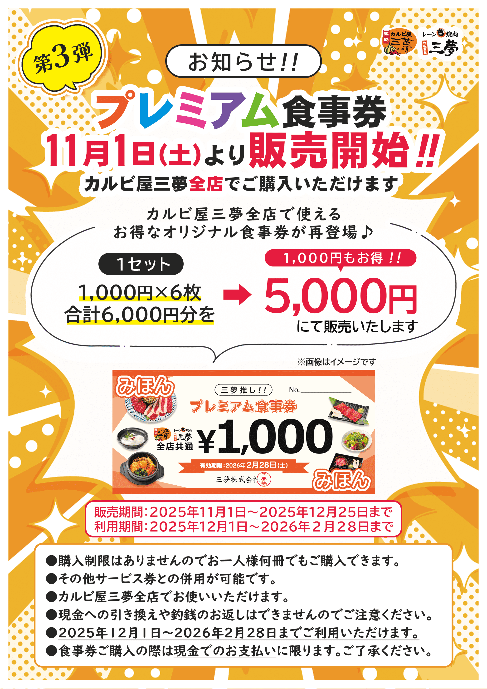 焼肉カルビ屋三夢全店で使えるプレミアム食事券が販売開始です!